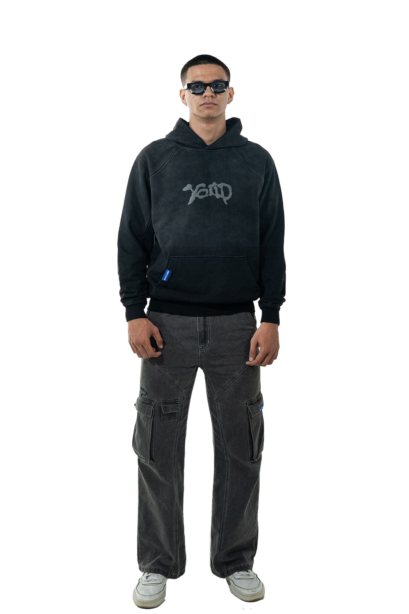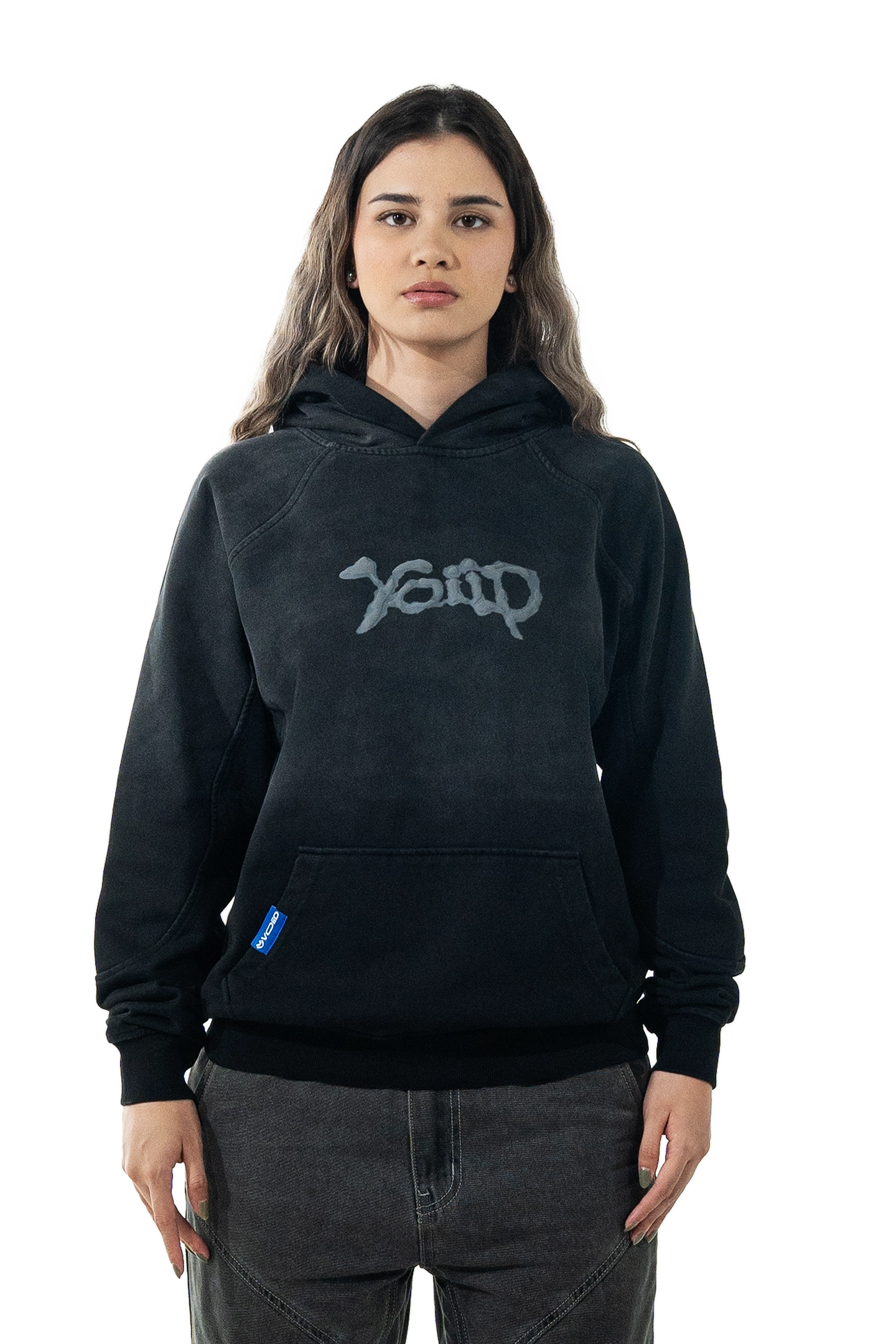 This hoodie is black fade washed with a oversize boxes style and with two print techniques screen, print and puff print to make aesthetic style