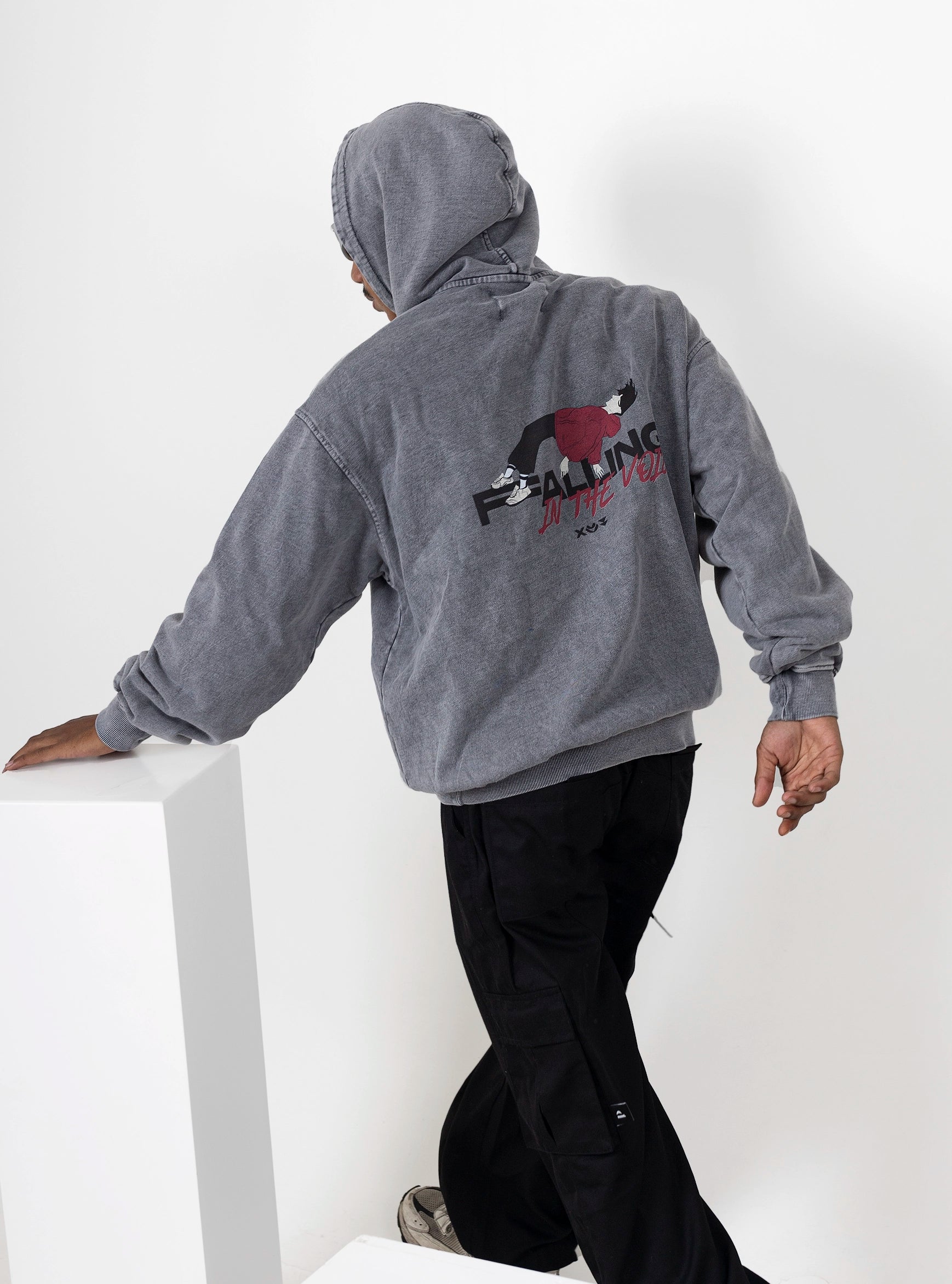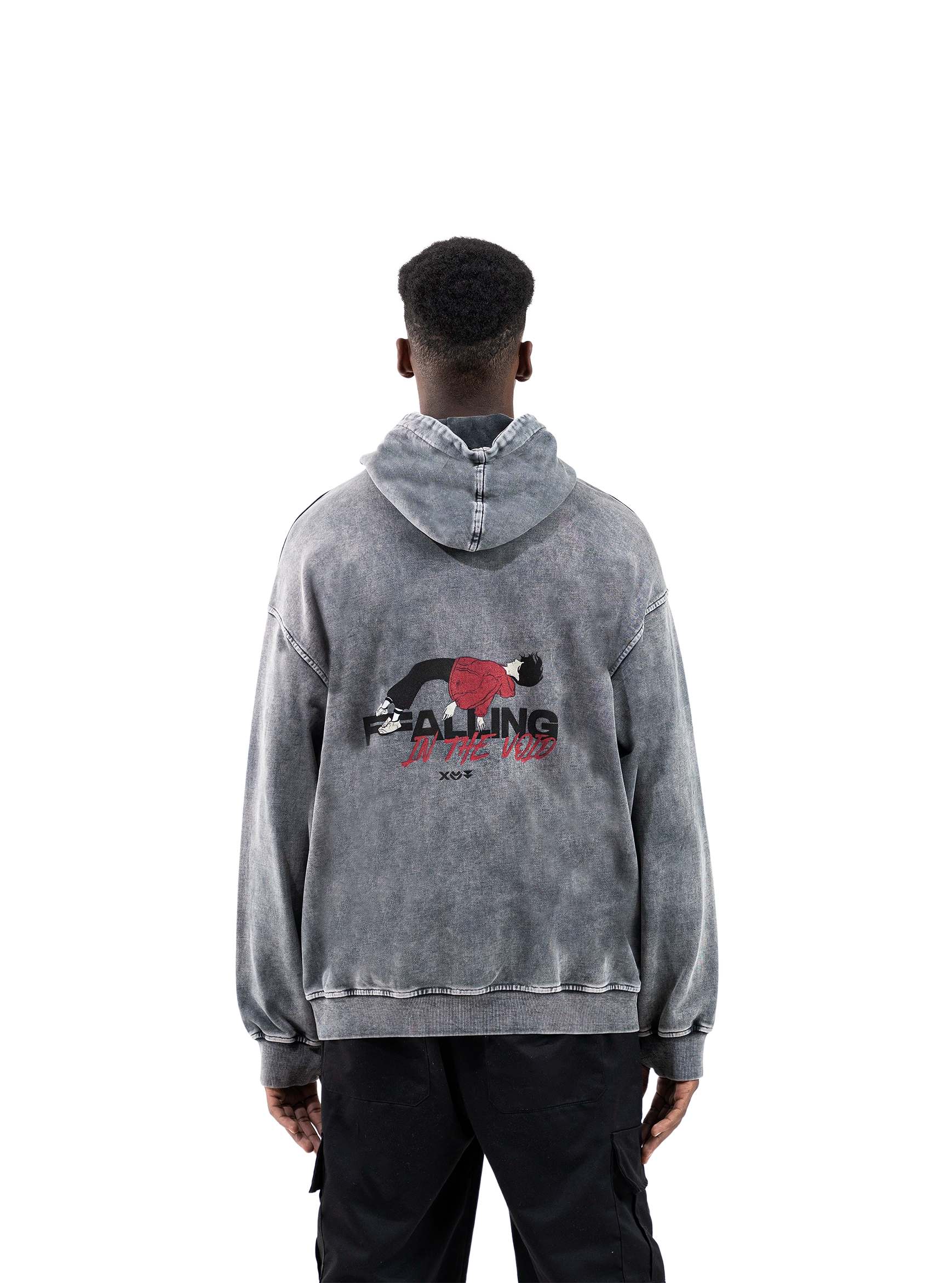 FALLING IN THE VOIID  - Is the second collections in our brand featuring this great black washed hoodie with a triple logo infront and in the back A Draw " that tells a story about a guy who is Falling and he knows that ,, but he's Fallnig with Style"
